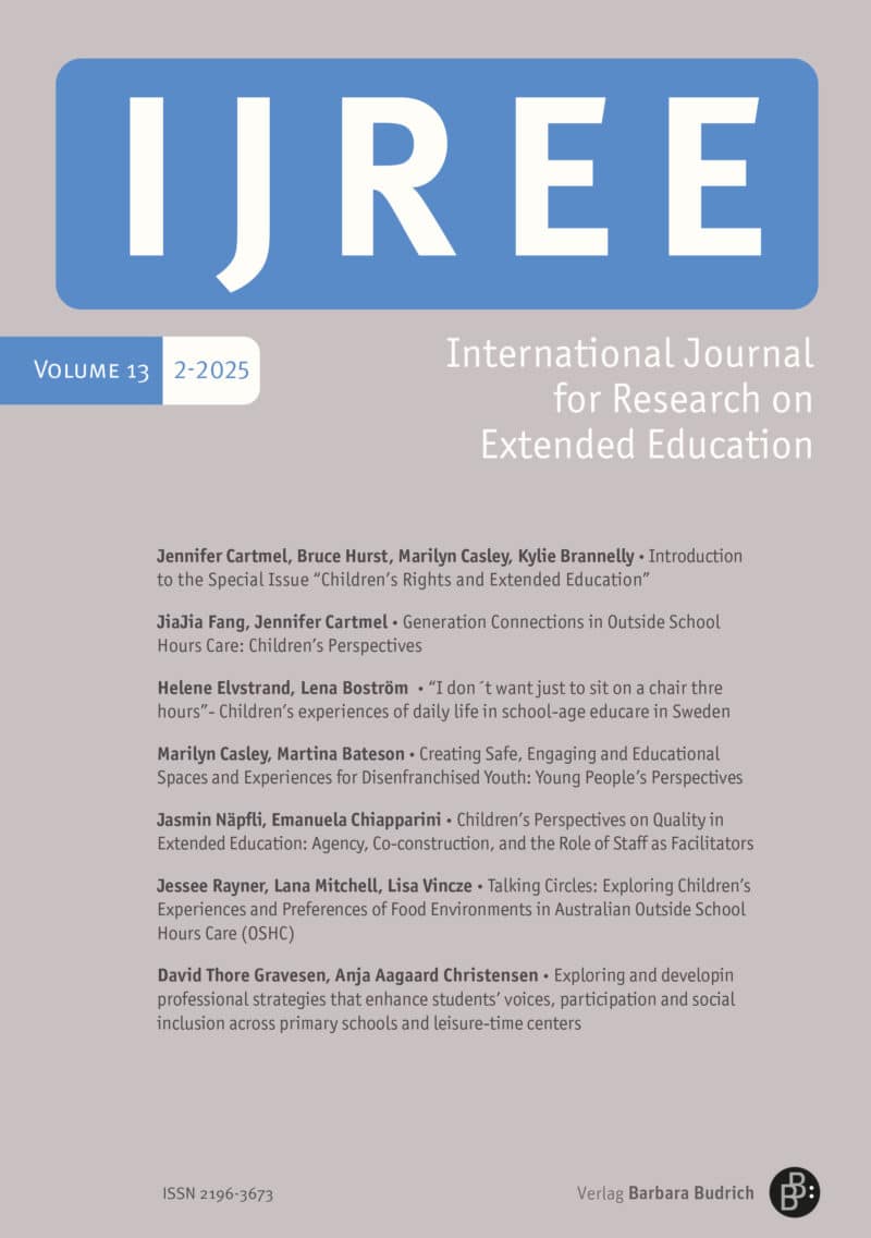 action research, agency, child-centred approach, children and young people’s voices, children’s participation, children’s perspective, children’s perspectives, children’s rights, children’s voices, deductive analysis, Dezember 2025, disenfranchised youth, ecological systems theory, educational engagement programs, everyday practices, experience and preferences, extended education, inclusion, intergenerational program, nutrition environment, outside school hours care, outside school hours care service, participation, professionalism in extended education, quality, school age care, school-age educare, sense of coherence, socio-pedagogical user research, staff, trauma-informed practice